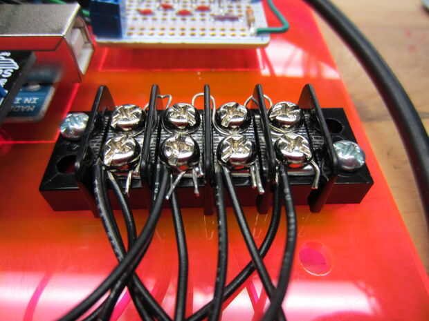 3. Conecte todos los cables negros de los LEDs al bloque de terminales como se muestra en la cuarta foto.  No importa qué tornillo se sujete a pero va a ser más fácil si conecta no más de dos por tornillo.