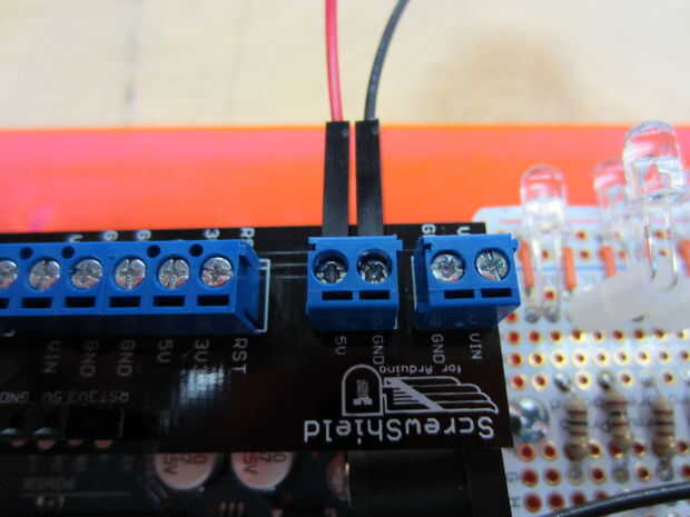 - Inserte el rojo (alimentación) y negro (masa) cables a los 5V y GND conexiones sobre el protector del tornillo y apriete los tornillos como se muestra en la primera foto.