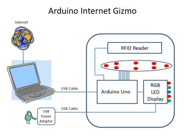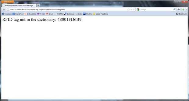 El Gizmo de Internet Arduino consiste en un Arduino, un lector de tarjetas RFID, un montón de LEDs y otros componentes montados en un caso de fuente de poder de PC reciclado conectado a un PC como se muestra en el primer diagrama. Arduino está ejecutando software que va a leer una tarjeta RFID cuando se coloca cerca del lector. Cuando se lee una tarjeta, el Arduino hace los LEDs en la parte superior el gizmo luz en secuencia y aparecen a la raza alrededor en círculos. ID de la tarjeta RFID es enviada a la PC mediante un cable USB que conecta el Arduino y el PC. En el PC, está ejecutando un programa Python en un bucle esperando datos de Arduino. Cuando recibe la tarjeta de identificación RFID de Arduino, busca el ID de tarjeta RFID en una tabla para ver qué sitio web está asociado con esa tarjeta. Si encuentra la tarjeta en la mesa, se abre una nueva pestaña en el navegador por defecto para el ordenador y carga el sitio web. Si el ID de tarjeta RFID no está en la tabla, el programa de Python crea una página HTML sencilla con un mensaje de error y el ID de la tarjeta RFID y muestra la información en una nueva pestaña en el navegador (como se muestra en la tercera imagen). Cuando se enciende el Arduino Internet Gizmo, ilumina un conjunto de color rojo, verde y azul LED para indicar que el cacharrito es operacional cambiantes.