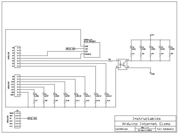 La segunda figura y el archivo PDF adjunto muestran el circuito esquemático para el Arduino Internet Gizmo. El lector RFID se conecta los pines de Arduino 3 y 4. El pin 3 se utiliza para el envío de que los datos de la tarjeta RFID para el Arduino y el pin 4 se utilizan para activar o desactivar la lectura. Pines de Arduino 6-13 se utilizan para controlar la iluminación de los LEDs en la parte superior el gizmo. Arduino pin 5 se utiliza para encender el color del LED rojo, verde y azul cambio de circuito. Pin 5 se conecta a un optoacoplador que convierte el color cambiar LED del encendido y apagado. Utiliza el circuito optoacoplador en lugar de conectar el color cambiar LED directamente a la Arduino porque el color que LEDs cambiantes dibujar diferentes cantidades de corriente y cambian de color con cinco de ellos, estaba seguro de qué efecto que tendría en el Arduino, así que sentí que era mejor usar el optoacoplador y el color que cambia LED independientemente de la energía.