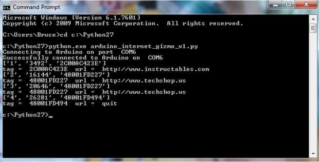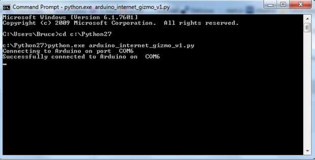 - Inicie el programa escribiendo: python.exe arduino_internet_gizmo_v1.py