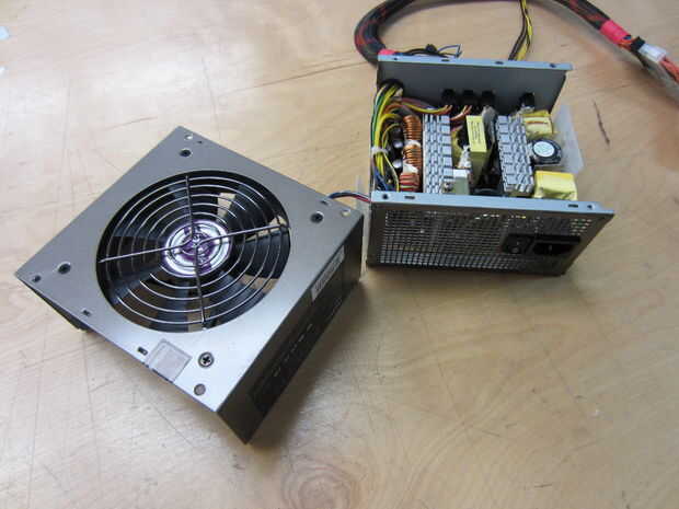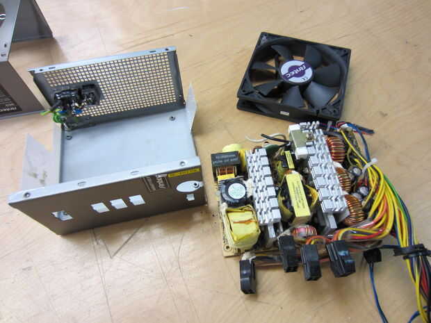 2. Quitar todos de las entrañas de la fuente de alimentación como se muestra en la tercera foto.  Usted necesitará quitar cables tornillos y los recortes para salir de todo.  Guardar las piezas para algún futuro proyecto (hay una gran cantidad de cosas buenas dentro de la fuente de alimentación) o disponer responsablemente de las tripas como e-waste.