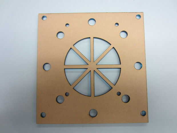 Utilice la cortadora laser para cortar las plataformas. "V10.cdr inferior de plataformas" y "Plataforma superior v10.cdr" se utilizan para cortar las plataformas superiores e inferiores, respectivamente. Utilicé un cortador del laser Epilog Helix 60 vatios y utiliza estos ajustes: