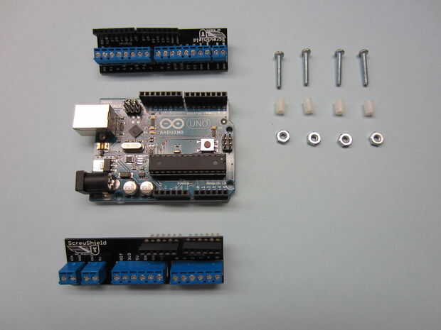 3. Conecte el ScrewShield a Arduino como se muestra en la última foto.  Es importante utilizar el ScrewShield y no inserte el conectar los cables en el conector tiras en Arduino: usando el ScrewShield para conectar todos los cables a la Arduino se asegurarán de que todas las conexiones están firmemente y no se deshecha después de haber montado el gizmo.