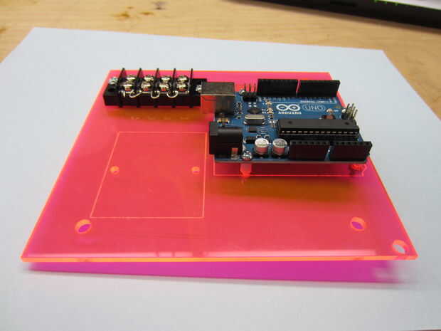 1. Monte el Arduino a la placa con los tornillos de máquina, espaciadores de nylon y tuercas como se muestra en las fotos segunda y terceros.  Suavemente apriete los tornillos con el destornillador mientras sujeta las tuercas con los alicates.  No no demasiado apretados o el acrílico se agrietará.