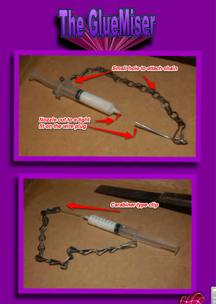 Ya que hacer un montón de impresión de inyección de tinta, para mantener los costos bajos, uso cartuchos recargables o sistemas de CIS, (tinta continua Supply System) y siempre tienen una gran variedad de jeringas ahí. Esta mañana, mientras que entretiene, que estaba limpiando para arriba, (una ocurrencia rara en este piso de soltero!) y encontré uno en el piso, y un pedazo de cadena ligera a mano y también encontró una botella de woodglue PVA que había gravitado en la planta baja del taller, con la habitual siezed inyector roto con un tornillo atascado firmemente en para mantener el líquido contenido. En un instante de inspiración, vi que podían combinarse para hacer una pistola de pegamento fácilmente recargables y fino, que pondría la cantidad correcta de pegamento de más o menos exactamente donde sea necesario, sin recibir por toda las manos, ropa y la madera, donde impide la aceptación de la mancha etc., haciendo una mancha fea en piezas acabadas.
