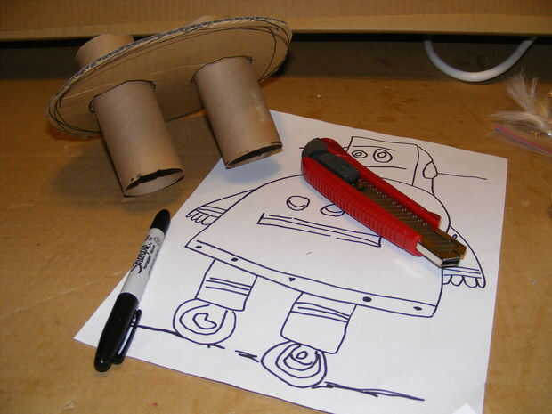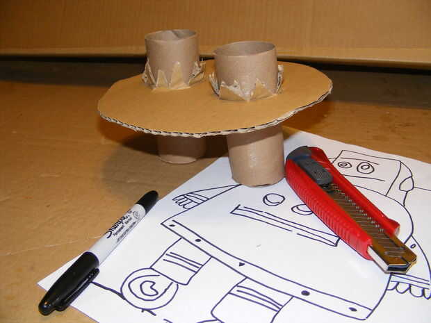 Dibujar una oval-ish forma redonda a la parte inferior del robot. Corte y laminado de dos o tres capas de cartón. Cuando se seque, coloque las patas en la forma y traza por los extremos de los tubos. Corte la cartulina dentro de los círculos que sólo trazó. Esta será la superficie de pegado y será una fricción para sostener las piernas.