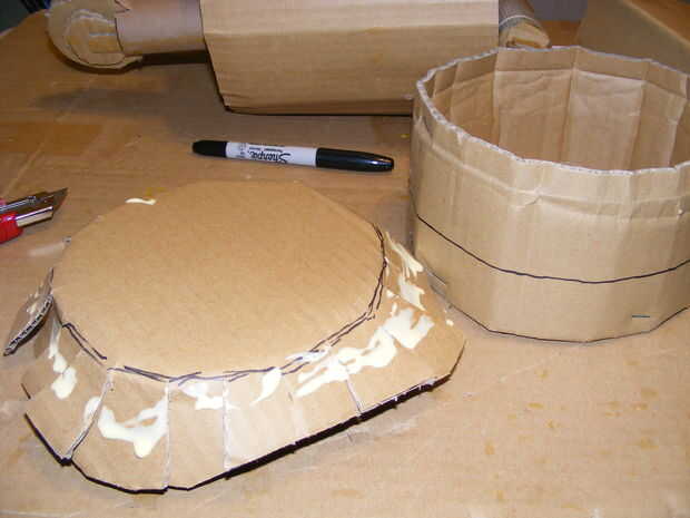 Tomar el anillo y traza un círculo de cartón. Hacer un círculo más grande alrededor de él y cortar como una cuchilla de turboventilador. Doble las lengüetas hacia adentro para formar la superficie de pegado. Introduzca este disco en su anillo y la cola en la línea para formar la plataforma principal del robot.