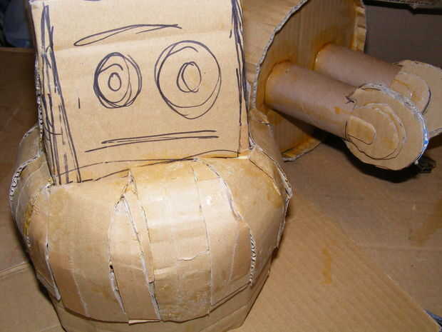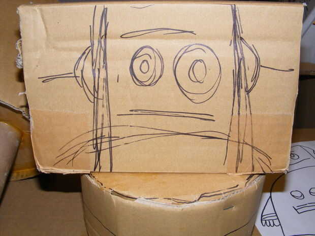 Crear una forma cuadrada de la cabeza del robot. La altura de la cabeza debe incluir la altura de la parte redondeada del hombro. Crear y pegar en otros detalles como los ojos, orejeras, 3 botones de cuerpo y ranura del cuerpo.