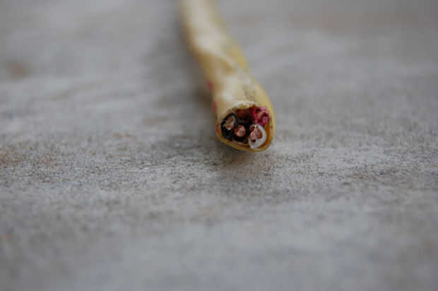 No sé lo que se llama el cable específico que utiliza para este instructable, pero tiene 5 cables en el interior, envuelto en una cubierta amarilla. Si no encuentras esto, basta con mirar para cable aislado que sea suficientemente fuerte para apoyar la cámara. Me quedo con alambre más grueso que tiene un aislamiento de goma.