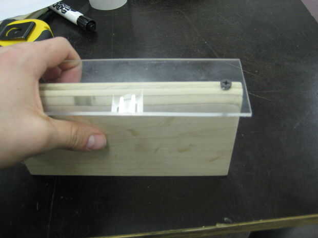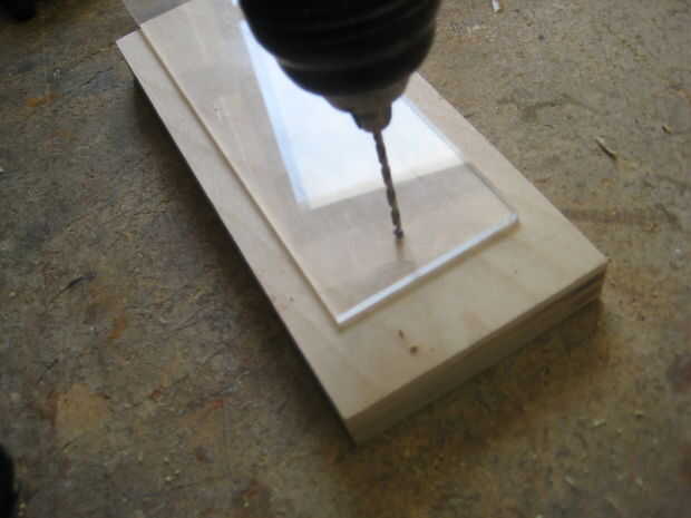 Después de marcar dos puntos en la madera, lo mismo para el acrílico. Entonces usando un 1/8 de pulgada broca, haga dos orificios en la madera y el acrílico. Finalmente con dos tornillos, sujete la pieza de acrílico en la parte superior de la pieza de madera contrachapada.