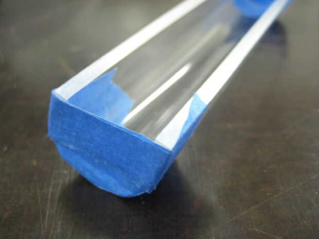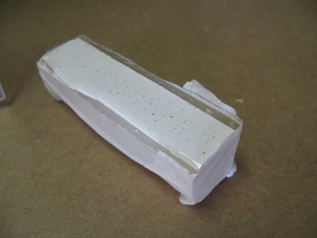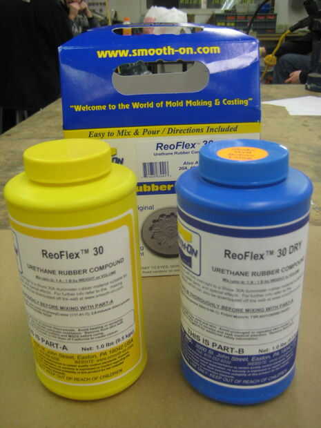 Después de retirar el acrílico del molde, cortar la zona con los orificios perforados y cinta los dos extremos que te quedan con un pequeño canal. Utilizando una goma de uretano (lisa en ReoFlex 30), mezclar las dos mezclas parte de 1: 1 y verterla en el acrílico a través. (Para obtener mejores resultados con acabado en blanco, nos liso en PMC 724)