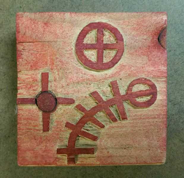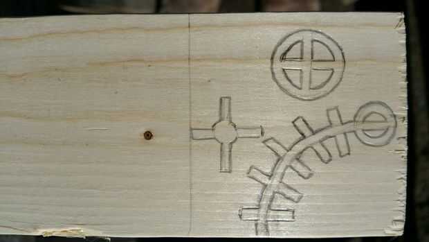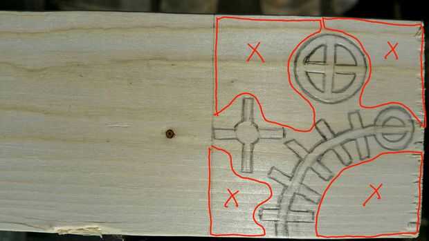 He utilizado un lápiz para dibujar mi diseño en un bloque de madera que era más grande que mi diseño real. La habitación más grande tamaño izquierdo para fijar el bloque mientras talla (Foto 2). Como se ve en la foto 3, las áreas delineadas en rojo, con una x en el centro, son las partes donde comencé. Estas son áreas donde existen ningunos diseños y el material puede ser tallado, sin demasiada preocupación por el resto del diseño.