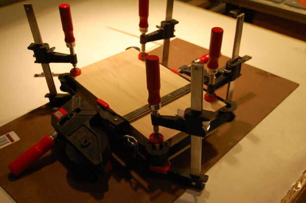Gracias a los ingletes acanalados, pegando los lados fue alcanzada con una abrazadera. Sin embargo, la parte superior quería deslizarse un poco, así que he añadido unas abrazaderas verticales y una abrazadera horizontal en el centro para evitar cualquier inclinación.