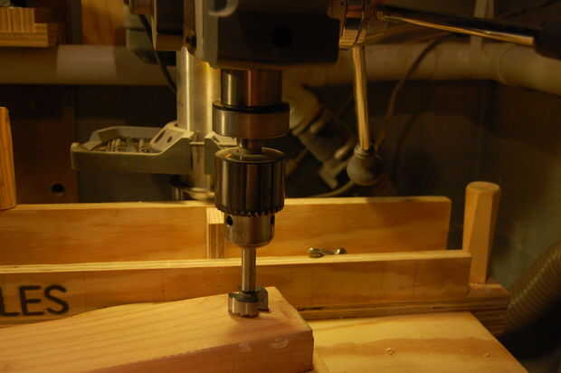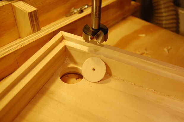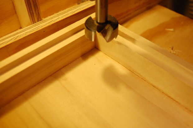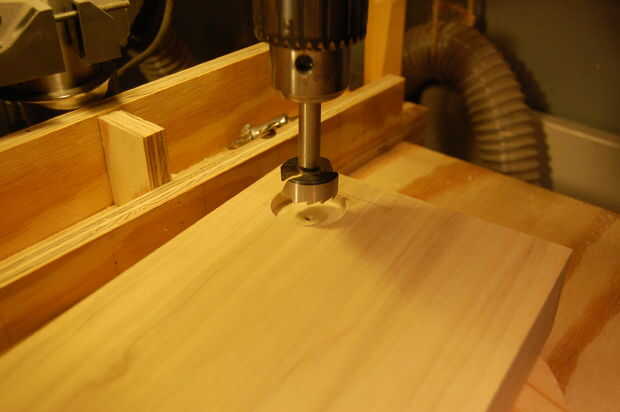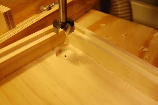 Para llevar a cabo el cuerno, la parte superior de la caja es necesario un agujero de 1 3/4" para aceptar el accesorio de cobre. Usé una broca forstner y perforado hacia abajo unos 3/8", que es la mitad del grueso del tablero.