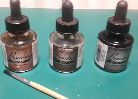 - Tinta de la India. YEP. Después de decenas de ensayos y errores (muchos errores), tinta de la India había trabajado mejor. Usé marrón, sepia y negro. Esto es para el detalle en la cáscara y la cabeza y aletas.