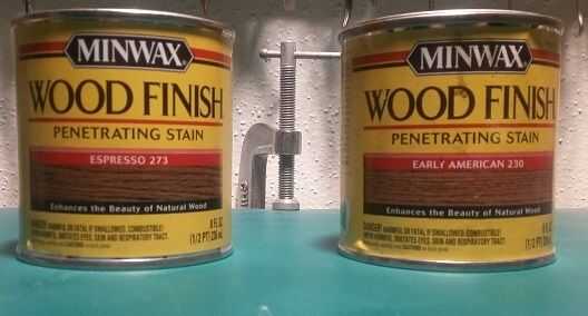 - De la mancha. He utilizado dos tonos diferentes. Uno en el de mediano alcance ("Primeros americanos", Minwax) y oscuro ("Espresso", también Minwax).