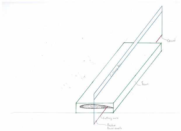 Un cortador de alambre caliente trabaja pasando electricidad a través de un alambre fino con una alta resistencia eléctrica. Esto hace que el cable calentar para arriba rápidamente. El hilo puede utilizarse entonces para cortar limpiamente a través de espuma e incluso cortar superficies de sustentación en las alas. Para este avión seleccioné el perfil 94 PSU-097 (