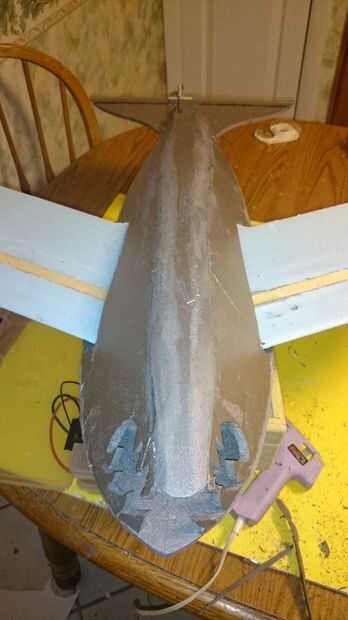 9. Por último pegamento caliente las aletas dorsales en el fuselaje inferior, teniendo cuidado de que estén alineados con la cola.
