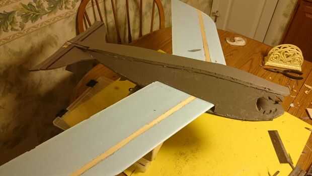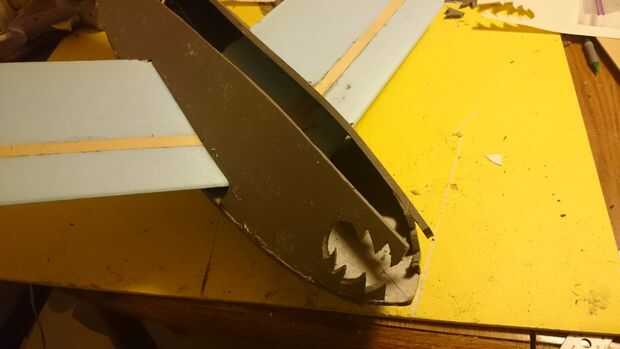 El fuselaje inferior está montado en el mismo señorío como el fuselaje superior. El único reto que enfrentaremos en el corte de la ranura en el panel lateral para el ala.