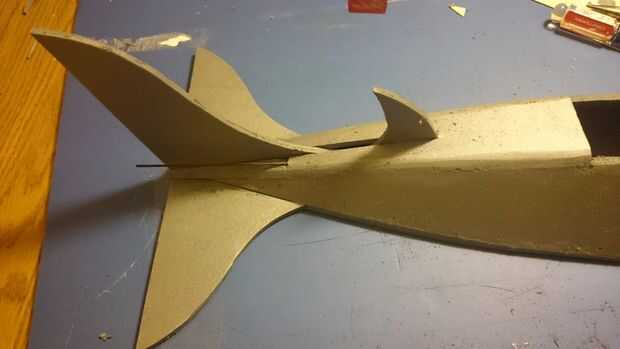 1. Use resina de 5 minutos para pegar la tapa de la cubierta trasera a los paneles laterales y la cola vertical y la aleta caudal. Pines se pueden utilizar otra vez para ayudar a mantener esta en posición mientras las secas pegamento