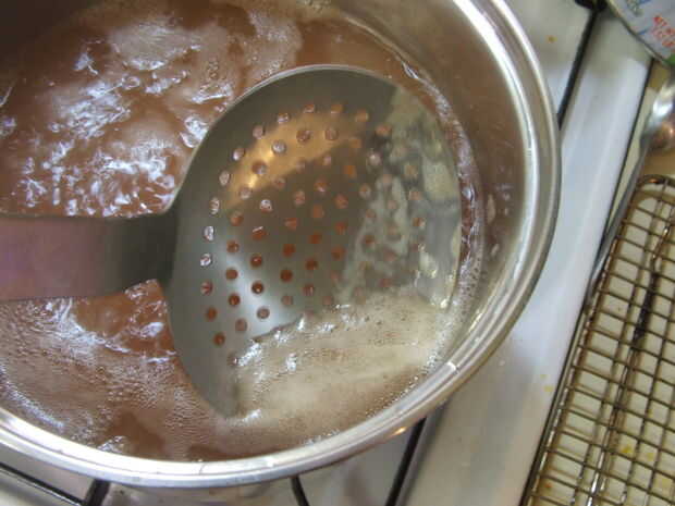 Ya llevó la mezcla a hervir y preparar mi limpiamos/tapas de frascos en un baño de agua hirviendo. siguió rozando la espuma como se desarrolló en la parte superior. Nunca he sido buena con el método de la cuchara para la determinación de cubrir, pero cuando empezó a mirar como jalea en el skimmer (15 minutos), he comprobado la temperatura de ebullición. Fue 217F: 5 grados por encima del punto de ebullición normal del agua. Fui por delante y poner en los tarros que esperar y ver lo que sucedió.