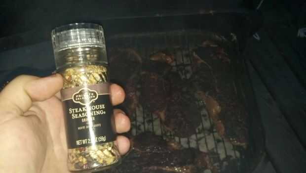 Décimo, mientras dorar el primer lado, utilizar la amoladora "Privado selección Steakhouse condimento" para cubrir ligeramente la carne con la mezcla de condimentos.