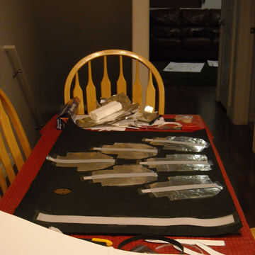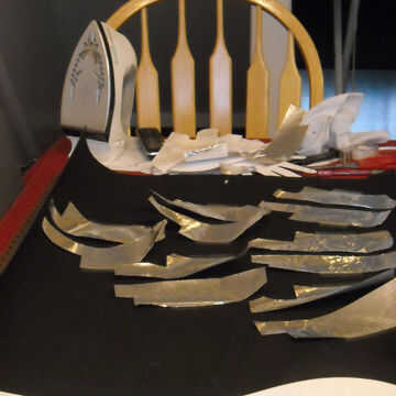 - Cuando estés listo, utiliza la plancha y planchar el adhesivo aluminio levantando cada sección, quitando el soporte de papel, sustituyéndolo en la espuma, y planchar sobre ella. Tener cuidado para evitar dejar la plancha descansan en la espuma, o derrita el material negro. Sólo necesitamos un sello "justo" en el adhesivo para evitar que el aluminio desplazamiento lado a lado y a corregir hacia abajo desde arriba en un paso posterior, ir tan fáciles en la plancha para ser seguro.