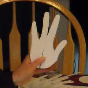 - Tomar el "mano cut-out" de principio y usar una regla para trazar dos líneas hacia abajo con la palma paralela a los bordes exteriores del dedo del medio, como se muestra. Utilice tijeras para cortar a lo largo de estas líneas para que el "recorte de la mano" está ahora en tres secciones con al menos un borde a cada uno que es recta (-ish).