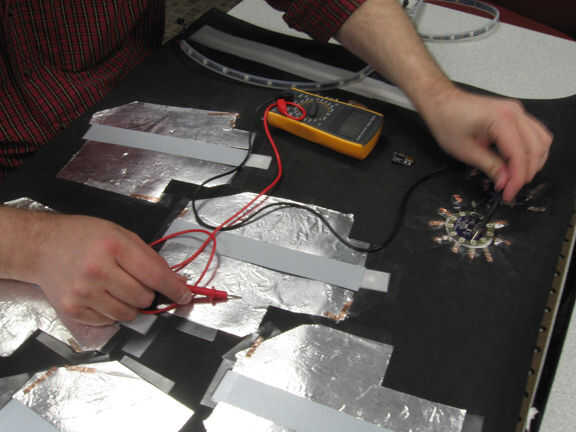 - Como cada final de la cinta de cobre es tirado a través, que será esencialmente arreglar nuestra "segunda página" y nuestra "tercera página" juntos. Esto está bien. Si es necesario desatarlo, la flexibilidad de la cubierta del carnaval y la espuma nos permitirá a las dos capas separadas de "proa" y entrar sólo soltando un par de los extremos de la cinta de cobre y haciéndoles retroceder detrás abajo. Esperemos que, sin embargo, no es necesario. Sin embargo, una vez que hemos hecho todo tirado de extremos cobre las manos formas a través de, es un buen lugar para probar nuestros circuitos de continuidad antes de pasar.