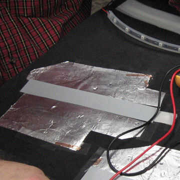 - Suponiendo que hay no está problemas a solucionar con los extremos de cobre para las formas de las mano, vamos a fijar hasta sus respectivos pedazos de papel de aluminio adhesivo. Siguiendo el esquema de la plantilla en este punto puede ser muy útil en el extremo incorrecto no se conecta en el lugar equivocado. Encontré que funcionaba bien a la curva y el ángulo el cobre cinta justo en la superficie de la "tercera página" por lo que pone de su lado no adhesivo encima de y en el borde de la sección de hoja de aluminio en cuestión. Nota que tiene una línea de contacto con dos secciones de aluminio no es una buena idea, aunque dependiendo de que podría tener suerte y todo funciona todavía (un problema con una tierra común). Una vez que coloque un extremo de la cinta hacia abajo, cinta ligeramente en su lugar con cinta adhesiva transparente y probar la longitud completa (aluminio-end-to-Lilypad-end) de continuidad.