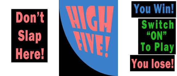 - Construir gráficos coloridos, informativos para indicar funciones de juego, imprimir en papel, recorto y fijarlos en su lugar en la "cuarta página", incluyendo uno que advierte a los jugadores no para pulsar el área debajo del cual se concentran el Arduino y circuitos.