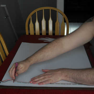 - Utilizando un lápiz del #2, una persona con una mano de "tamaño normal" (unos 8' desde la punta del dedo meñique hasta la punta del pulgar cuando los dedos están ubicados) trazar el contorno de sus dedos confortablemente separados y Palma en un pedazo de papel del rasguño. Esto se convierte en la palma de la plantilla (llamado el "mano cut-out" cuando se utiliza más adelante) y se utilizará en la primera hoja de cubierta del carnaval para marcar donde las formas de mano será para la plantilla. Una vez cortado con tijeras, la palma de la plantilla puede colocada alrededor de la región central inferior de la hoja de plantilla y remontar otra vez con cuatro cosas en mente: (1) mantener unos 2" espacio entre las formas mano dibujadas, Oriente (2) las manos naturalmente hacia la posición del cuerpo del jugador, (3) no muy lejos la mano superior espacio para que sea difícil llegar rápidamente durante el juego y (4) no multitud el espacio destinado a las luces de señal, Arduino, la tira o el interruptor.