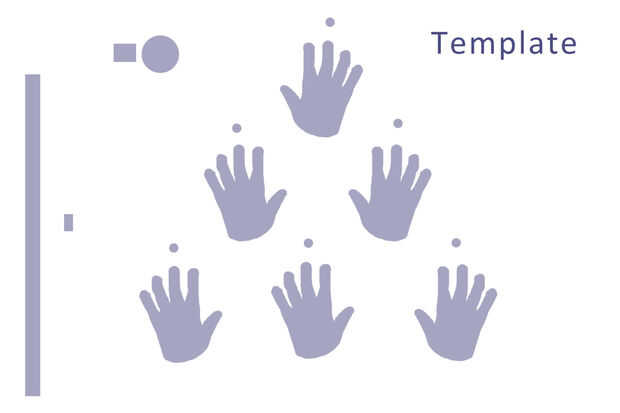 - En la colocación de las formas de la palm en la plantilla, decidí invertir la mano de las formas de la mano en el lado izquierdo como para permitirse el lujo de un jugador con las dos manos para jugar. Esto no es necesario, sobre todo porque parece que un jugador puede realizar mejor en el juego eligiendo solamente una mano para usar en lugar de dos. A pesar de todo, como son formas de mano, tamaño similar y espaciadas lo suficiente y regularmente entre sí, debería funcionar.