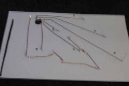 - Coloque la cinta de cobre a lo largo de todas las trayectorias discontinuas que ha aplicado a esta capa, dejando 2" extra en cada extremo como se medida y corte y limpio doblado de la cinta alrededor de curvas cerradas en vez de intentarlo de la curva. Esto debe hacerse dos veces por cada mano en forma de (una línea de tierra y una línea de señal) y dos veces para el interruptor.