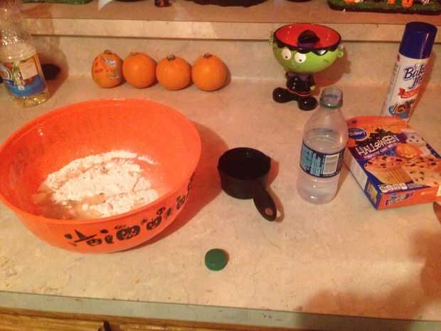 Mezcla la mezcla de harina de Halloween ingredientes en un bol, revolver con una cuchara o un tenedor que oxigena la mezcla mejor y asegúrese de que usted utiliza agua fría hace que la torta sí mismo suelto.