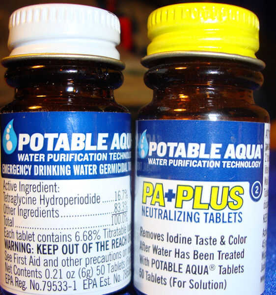 Hay agua pastillas potabilizadoras - eficaces pero a menudo mal sabor. (¿Mal gusto o muerte? A escoger la vida.)