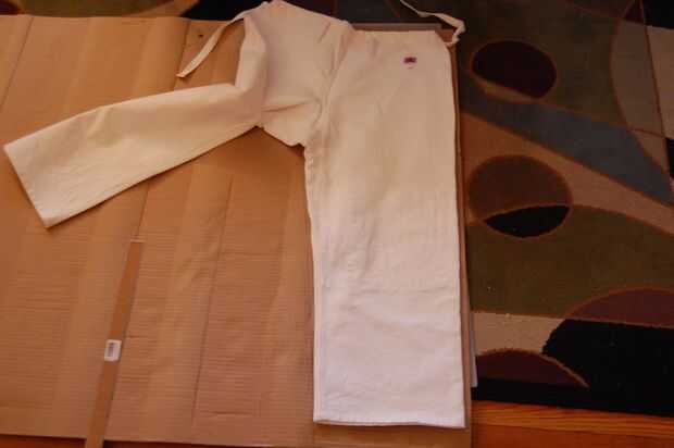 Para la plantilla de pantalones, usé mis pantalones de Judo Gi desde 1995 (sí, todavía cupieron). Para las plantillas de torso y brazo, usé una sudadera holgada con capucha. Después de trazar las prendas reales, había refinado de las líneas y luego 1/4" al esquema para acomodar la costura al coser. Para las manos, utiliza las plantillas de disfraces de animales, pero ampliado (allí eran un poco apretado). Para la cabeza, utilicé la plantilla ampliada del 380%.