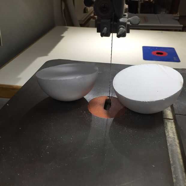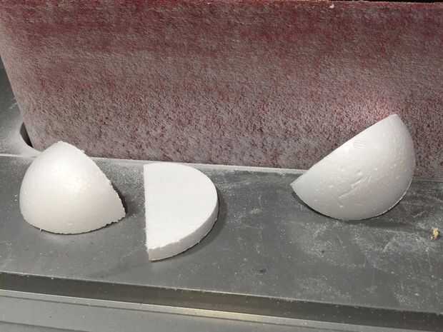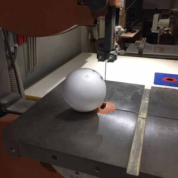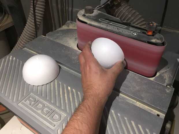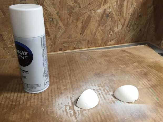 Para la cara de Oscar, empecé con los ojos, que fueron cosechados de una bola de espuma de poliestireno de 4 solitarios ". Primero, cortar por la mitad y lija suave en las líneas de corte. En segundo lugar, cortar cada mitad hasta aproximadamente 2/3 de su hemisferio original. Después de eso, era sólo una cuestión de reducir su tamaño hasta que fueron proporcionales a la cabeza. Una vez que estaba feliz con el tamaño, eran aerosol pintado de blanco.