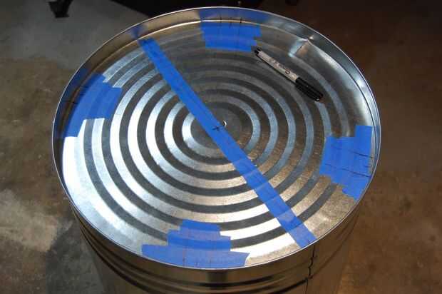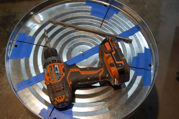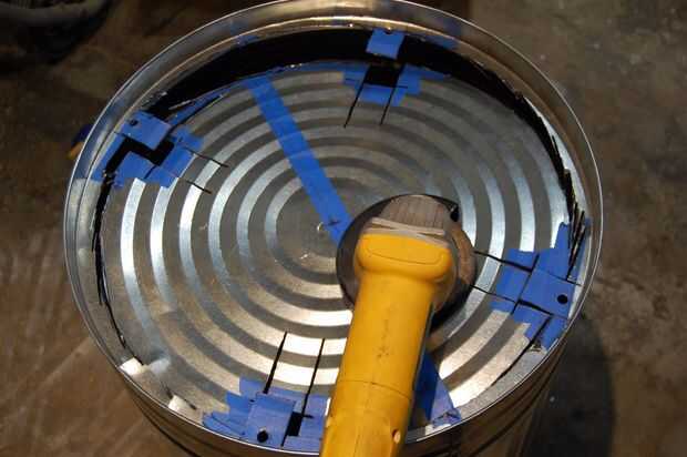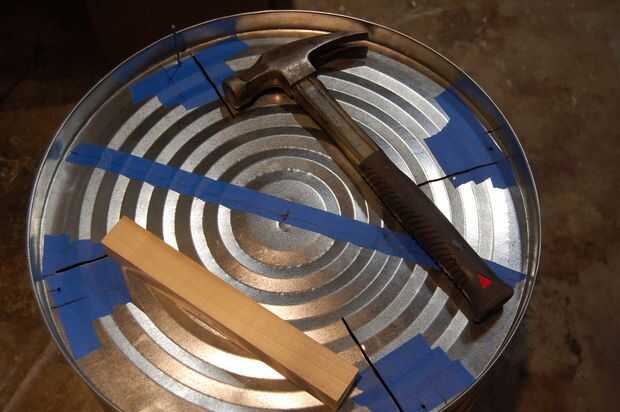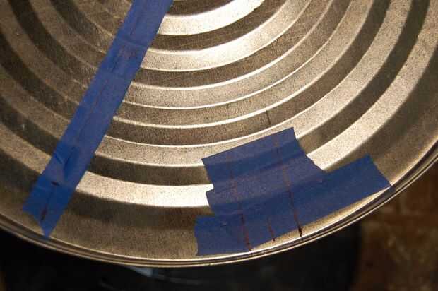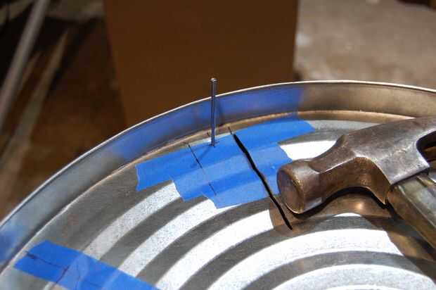 Hice mi diseño utilizando cinta de pintor y un rotulador. Una vez que se determinaron las pestañas, había golpeada con un clavo y un martillo... y entonces agrandado ese agujero con una broca de taladro. Bordes afilados se llamó detrás con un archivo de cola de rata.