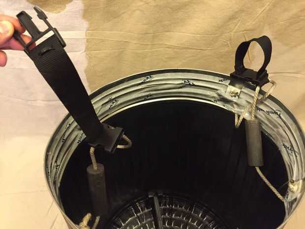 Cuerda de nylon se rosca a través de dos lengüetas a cada lado... y he añadido secciones de clavijas para las manijas en el caso que quería/necesitaba les. Tuve algunos nylon al azar y clips de plástico en un cajón, ésos como una forma de colgar la poder del arnés que hice usé.