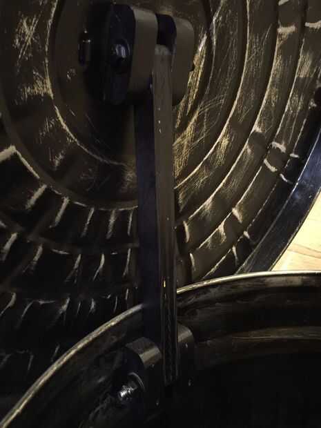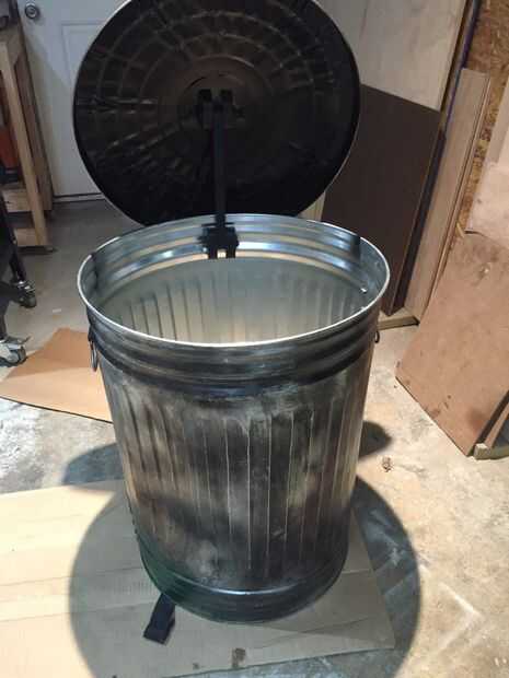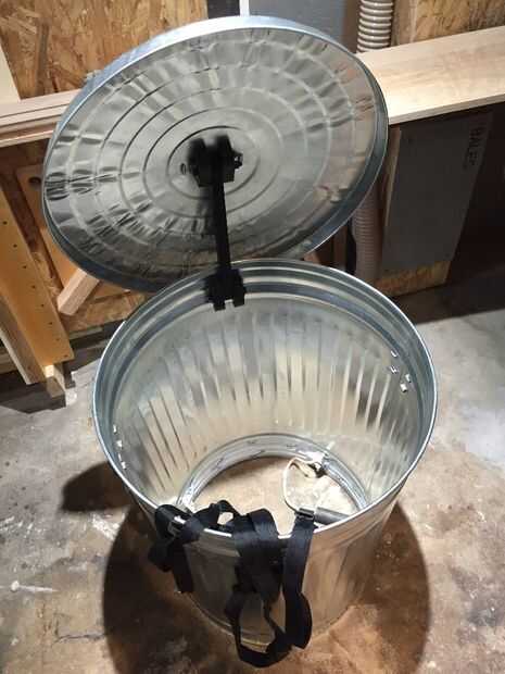 Puesto que quería ser capaz de descender en el poder, necesitaba hacer una bisagra para la basura puede tapa. Esto hice con madera de desecho, chatarra álamo y pernos/tuercas/arandelas de 1/4-20. Las dimensiones de parte del pasador de bisagra no importan... usted apenas necesita a hurtadillas en la longitud de tu enlace para que usted no corte demasiado corto (como lo hice la primera vez).