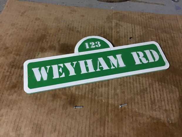 El cartel fue fabricado a partir de un trozo de 2 x 4 y se lleva a cabo junto con 2 tornillos. El signo actual es de desecho 1/4" madera contrachapada y cortar en la Sierra de cinta. La plantilla es simplemente estándar, texto impreso de photoshop y recortar con un cuchillo o exacto.