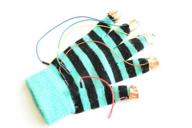 Mientras usa el guante (para asegurar el mejor ajuste), envuelva alguna cinta de cobre alrededor de su dedo. Usted quiere la punta del cable a posición plana contra la cinta que apenas envuelto alrededor de tu dedo para que el resultado final será la punta del cable conectada a su dedo entre las capas de cinta. Tomar la punta metálica de cualquiera de los extremos del alambre y manténgalo contra la punta de su dedo con la cinta envuelta alrededor de él. Al hacer esto, comienzan a envolver la cinta de cobre alrededor de la punta de alambre, envolver bien a la primera capa de la cinta. Esto puede ser un poco de un proceso difícil hacerlo sin ayuda de otra persona pero absolutamente puede hacerse. Usted quiere la punta a cubrirse totalmente en la parte inferior y la parte superior. No vaya por la borda con las capas añadiendo 10 capas a dónde está la punta metálica, porque frenaría la punto que presiente. Sin embargo, sienten libres de moverse hacia arriba y hacia abajo con la cinta de embalaje para proporcionar el cable más estructura como se ve en la foto.
