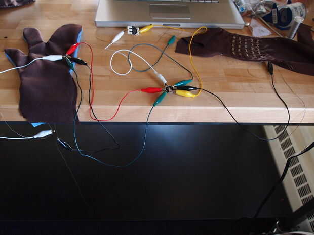 Gire a la derecha de guante hacia fuera y gancho-up los clips de cocodrilo conectando el panel LED de la tela del guante, batería y acompañamiento de tablas para probar y asegúrese de que todos los circuitos de trabajo.