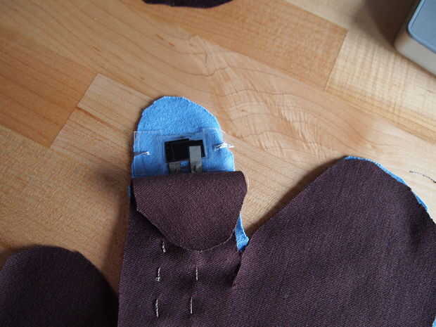 Para colocar el sensor de contacto en el guante, coloque aproximadamente donde quisiera tocar la punta del dedo dentro del guante. A continuación usando hilo no conductor, coser el sensor a una de sus recortes de la mano. Ahora usando el hilo conductor, coser a través de una de sus tiras de tela conductiva a un recorte de segunda mano y coser una línea recta. Hacer lo mismo con la tira restante de tela conductora asegurándose de no cruzar la línea del otro circuito.