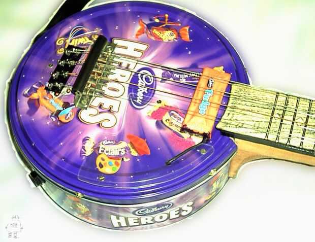 No es bastante una mandolina o un banjo. Suena un poco como un electro-acústico-12 cuerdas. Se relaciona con una guitarra de caja de cigarros, se ve un poco como un "Rickenbacker sartén", se hace casi en su totalidad de la chatarra y lo llamo...