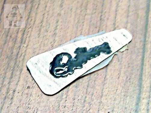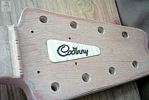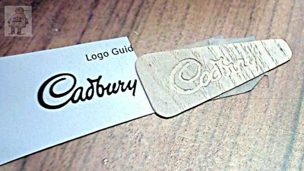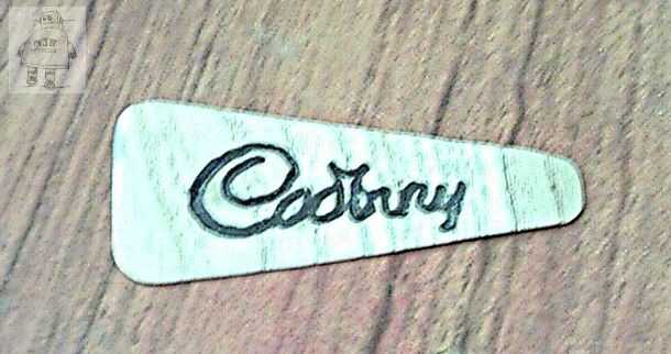Utilice un pedazo de la chapa de la ceniza para hacer un logotipo "Cadbury" temática. La forma era corte y redondeada por la mano entre los árboles de la cadena. Sellen con cinta adhesiva de doble stick y luego usar un poco de pequeño grabado montado en un taladro de minicraft/dremel, en una plantilla para fijar la altura y posición. Recuerde, esta chapa 0,6 mm de espesor, y no necesita cortar a través!