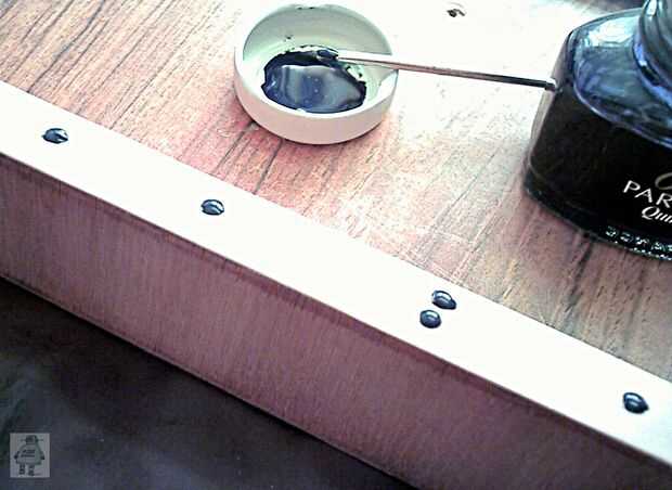 Ahora mezclar una mezcla de pegamento PVA para madera y agua tinta azul-negro basada (Parker/Quink) y llene excesivamente la placa al ácido. Se encogen al secarse, así que lo llene. Cuando esté seco, lije. Arena y lijar más hasta que la palabra se convierte en claro. Coja un cuchillo x-acto hacia fuera y poco puntos o bits que quedan.