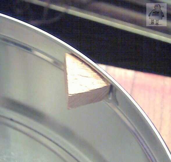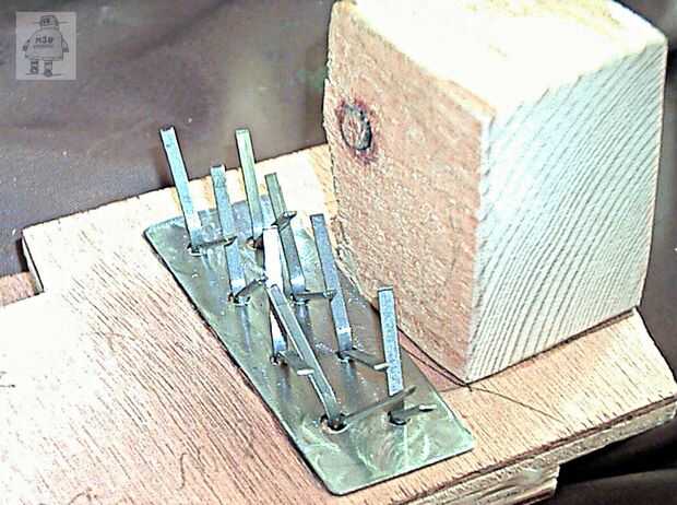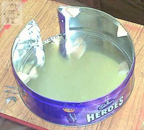 La tensión de las cuerdas cambia ligeramente la forma de la tapa y el cuerpo. He añadido algunos tornillos para mantener la tapa en su lugar correcto, con bloques de madera en el interior de la lata para que atornille. Los agujeros fueron perforados por el metal, bloques de madera encoladas (araldite) detrás de ellos. Más tarde, un agujero guía para el tornillo va, y un tornillo con arandela de número 4 lleva a cabo hacia abajo.
